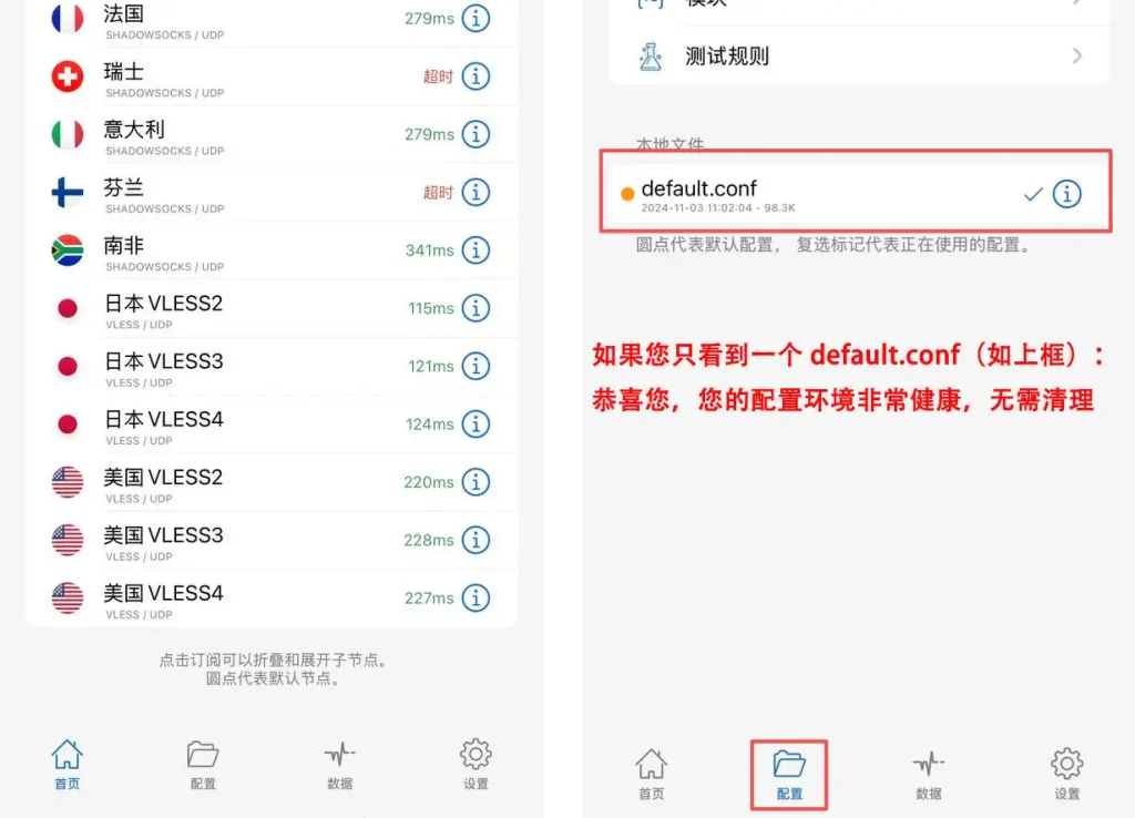 default.conf(👇如下图): 恭喜您,您的配置环境非常健康,无需清理,直接执行下一步“添加官方规则”即可。 - 为什么要这样做? 就像给电脑重装系统一样,彻底删除那些来源不明、含有广告拦截冲突的旧配置,是确保 2026 官方优化规则生效的唯一途径。